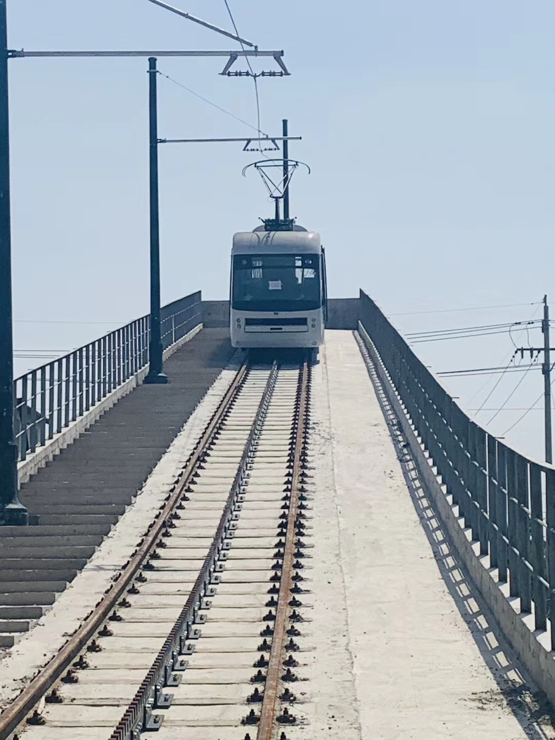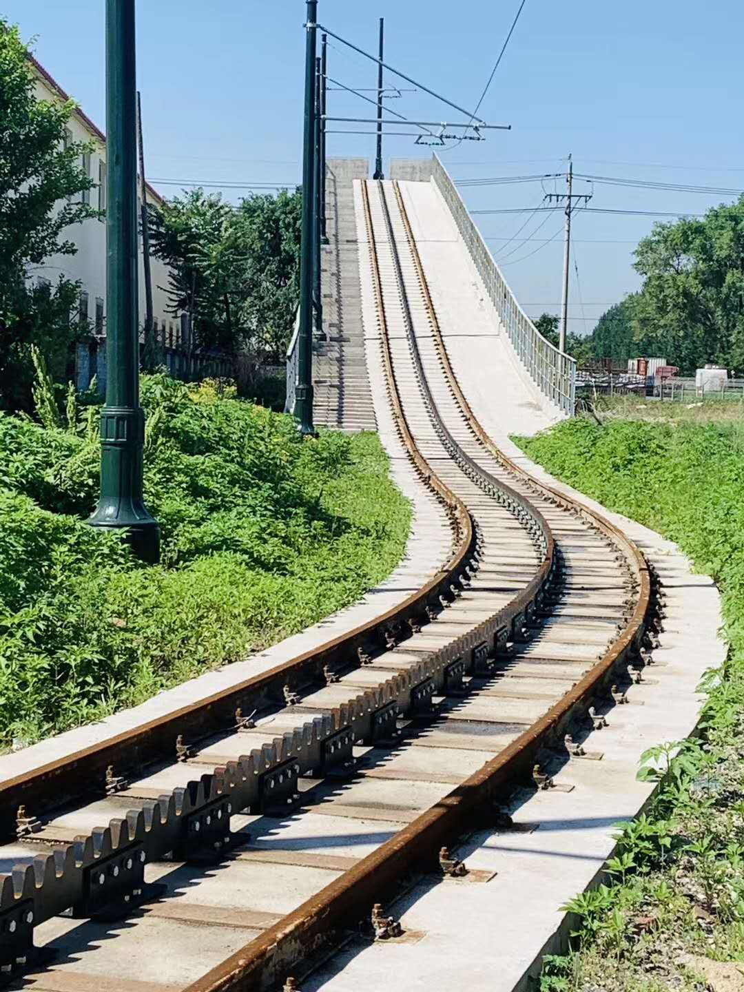 这样有轨电车便能克服黏着力不足的问题,在>20%的陡峭斜坡上运行,也可多节连挂,组成铰接车运行。